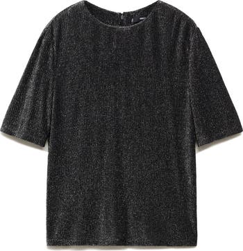 Glistening metallic shimmer elevates this boxy top updated with abbreviated sleeves.