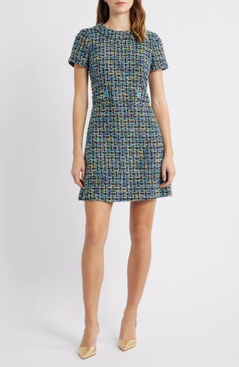 Colorful tweed and a shot of shine define a desk-to-dinner dress cut from a wool-kissed fabric.