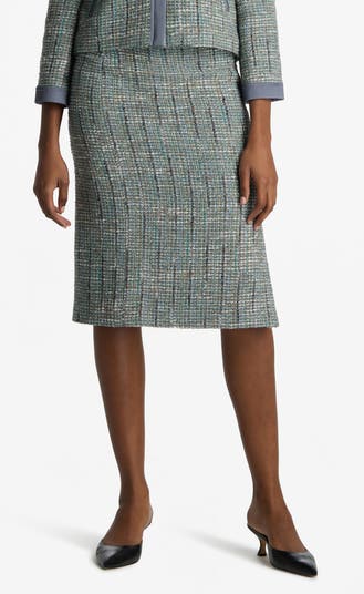 Smooth satin trim echoes the gleam in the Italian metallic tweed of this straight skirt with a touch-of-moto side-zip closure that finishes with a side slit.