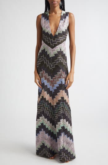 Iconic since the '60s, Missoni's signature zigzags get glitzed up with twinkling metallic threads in this ultralightweight, free-flowing knit dress softly structured with a reinforced bodice.