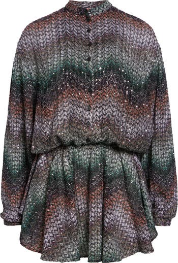 Iconic since the '60s, Missoni's signature zigzags get glitzed up with scores of twinkling sequins and metallic threads in this blouson minidress made with hand-spun yarns from the maison's Caperdoni loom—fusing the flexibility of knitwear with the structural integrity of woven fabrics.