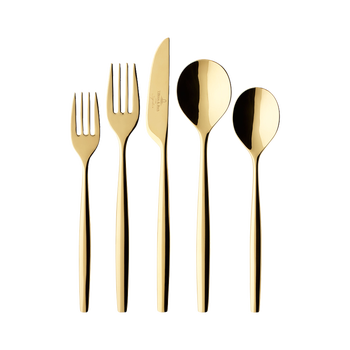 Metro Chic flatware stands for pure elegance. The design is noted for its fine, elongated lines and unique modern proportions. Each 5 piece place setting consists of one each : Dinner Fork, Salad Fork, Dinner Knife, Soup Spoon, and Teaspoon. 18/10 stainless steel offer 18% chromium for strength and durability and 10% nickel for luster and shine that never needs polishing. The stunning gold finish adds a luxurious accent to your table. Dishwasher safe.