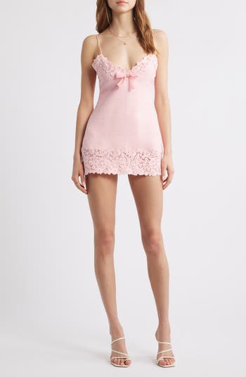 Lovely lacy trim romances this figure-skimming dress cut in a leggy length and topped with slinky spaghetti straps.