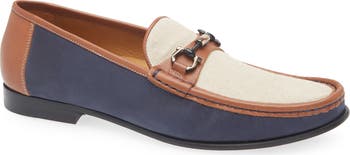 Contrast panels of leather, suede and linen give a playful vintage feel to this sophisticated bit loafer set on a cushioned leather footbed.