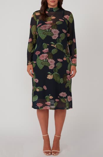 This gauzy mesh midi dress with a mock neckline and a smooth, curve-skimming silhouette features a vibrant cactus print that makes a bold impression.