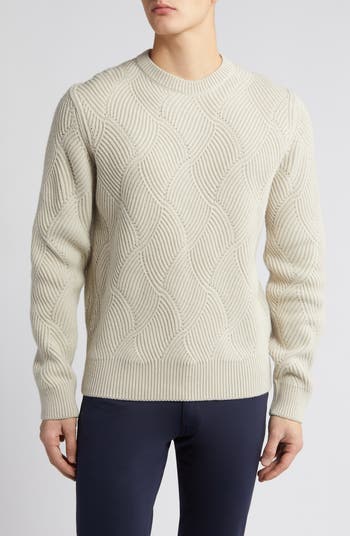 A wavy stitch pattern gives a contemporary update to a classic crewneck sweater knit from soft virgin wool and cashmere.
