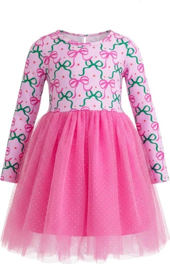 - Features a long sleeve pink bodice with a playful all-over green and pink bow print sprinkled with tiny stars