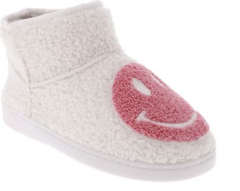 A colorful smiley patch fronts a bootie-slipper topped and lined with fluffy faux shearling.