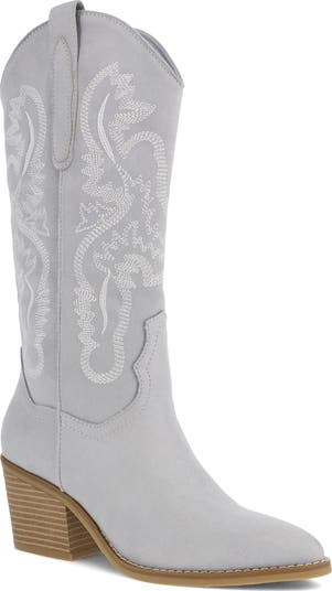 Intricate topstitching enhances the Western charm of this soft faux-suede boot framed by a curved topline with dual pull tabs and a stacked block heel.