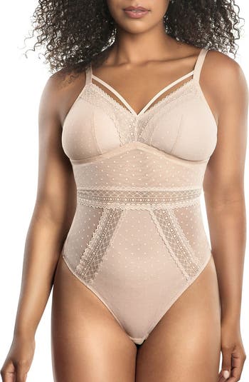 The perfect bodysuit for every body! Our Mia Dot bodysuit has wire-free, mesh dot lace cups with removable and reversible padding. The ultra-flattering V-shaped back and thong back ensure no visible panty lines. Perfect to wear alone or underneath clothing.