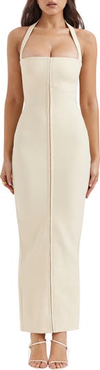 Hook-and-eye details fall down the front of this pretty crepe cocktail dress designed with an easy-moving back slit and signature corsetry details.