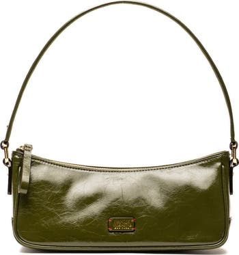 A gleaming logo shines against the crinkled leather of a minimalist shoulder bag designed in an elongated silhouette.