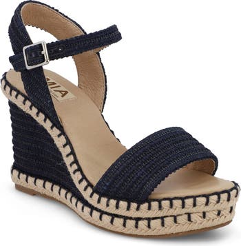 Woven raffia and whipstitched trim bring summery texture and style to a lofty wedge secured by an adjustable strap at the ankle.
