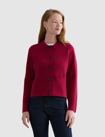 Collared merino wool blend cardigan, sculpted for a tailored silhouette, sumptuous to the touch, ideal for chic layering from office to weekend.