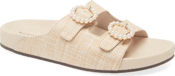Faux pearls adorn the cylindrical buckles on a casual slide sandal rendered in finely woven raffia and grounded by a cushioned footbed and modest platform.
