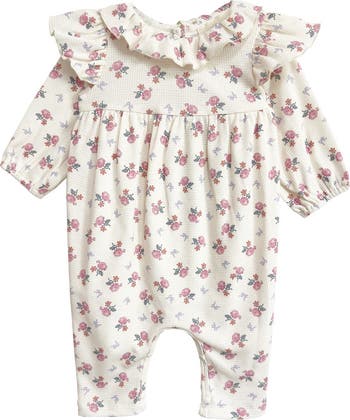 This delightful one-piece features a soft cream backdrop adorned with a delicate sprinkle of pink and green florals, perfect for any day that calls for something extra special. The ruffled neckline and shoulders, combined with the softly gathered waistline, lend a sweet touch to this cozy, all-in-one design. Fabric Content & Care 60% POLYESTER 35% COTTON 5% SPANDEX Machine Wash Cold | Line Dry | Do Not Bleach