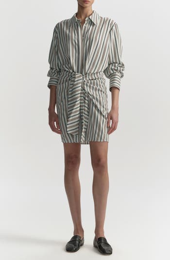 This mini shirtdress features a classic spread collar and long sleeves for a timeless foundation. Cut from a striped fabric with a tie-front detail at the waist, it's finished with front button closures for an easy, flattering take on the shirtdress silhouette.