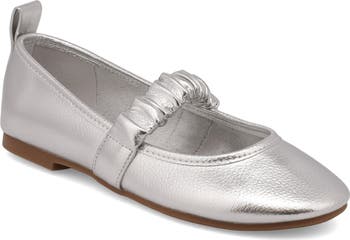 A stretchy mary jane strap and rear pull-tab offer easy wear on a leather flat grounded by a contoured footbed.