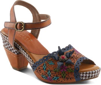 Laser-cut perforations and an embellished floral appliqué bring stylish artistry to a tanned leather sandal lofted by a mixed-media heel.