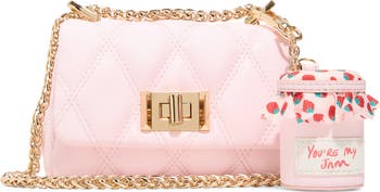 Pretty, pink and extrasweet this crossbody is suspended by a gleaming chain strap and comes complete with a punny zip pouch for added charm and storage.