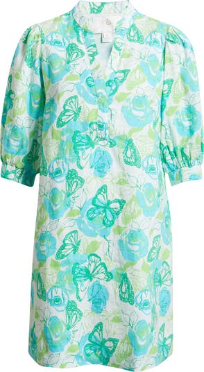 A colorful flower and butterfly print makes a dreamy statement on this lightweight linen shift dress.