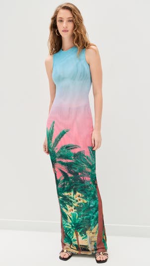 Fabric: Lightweight, super-stretch meshOmbre and palm tree printMaxi lengthCrew neckSleevelessPullover design, no closureShell: 100% polyesterDouble-layeredHand wash