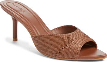 This pointed-toe sandal made with a woven strap of faux leather is balanced by a slim stiletto heel