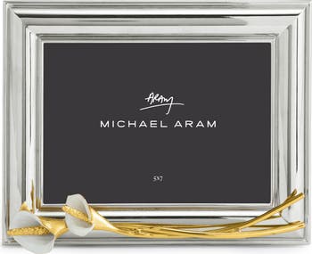Slender calla lilies—cast in shining gilt and snowy enamel—twine along the base of an elegant silvertone frame.