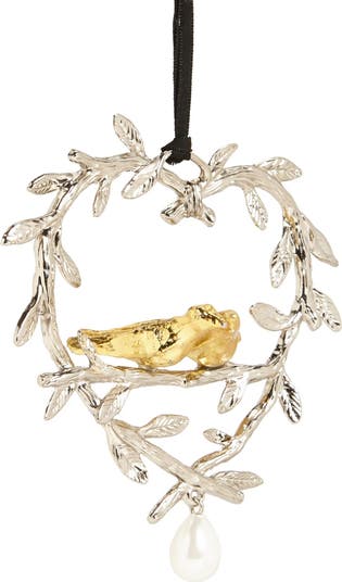 Two gilt lovebirds sing wintry songs inside the heart-shaped wreath that composes a keepsake ornament finished with a teardrop faux pearl.