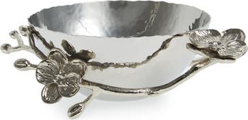 Delicate orchid blossoms add an elegant touch to a gleaming silvertone bowl.