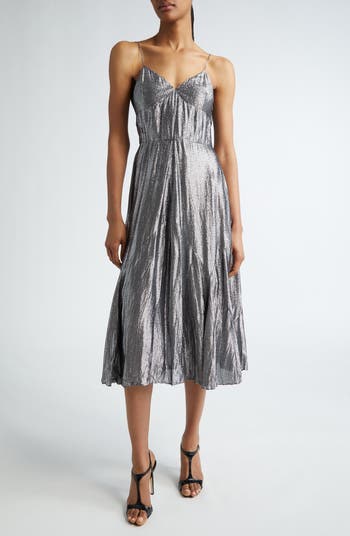 From Kors's fall '24 collection that was significantly inspired and influenced by his grandmother's simple and chic 1930s wedding dress, this crushed metallic cocktail midi appears to step directly out from the silver screen and into the pantheon of contemporary evening couture.