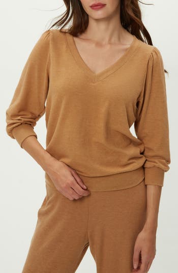 Blouson three-quarter sleeves and a banded hem frame a comfy-casual V-neck top that'll be a go-to in your everday wardrobe.