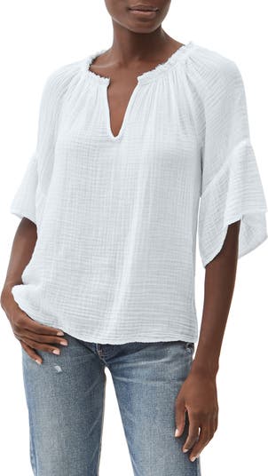 Elbow-length flutter sleeves enhance the airy warm-weather bliss of a cotton-gauze top made with an unfinished neck to underscore the casual feel.