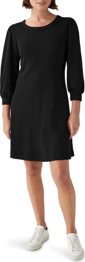 Three-quarter sleeves frame a soft cotton knit dress shaped in a stem-baring silhouette for modern appeal.