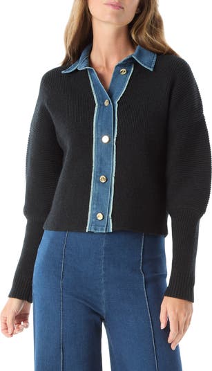 Statement sleeves and a denim detail make this cotton-blend sweater a fun-to-wear staple.