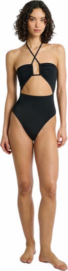 • Our Michela one-piece, cut from stretch tricot swim fabric, is distinguished by a plunging neckline that leads to a front cutaway. It has adjustable halter straps that tie behind the neck, a u-wire that provides structure to the lightly ruched cups, and a high-cut leg.