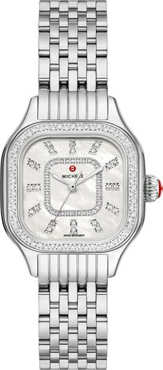 Rounded corners add modern elegance to the case of a stunning watch that sparkles with 64 prong-set diamonds. A mother-of-pearl dial and a gleaming seven-link bracelet make the style truly timeless.