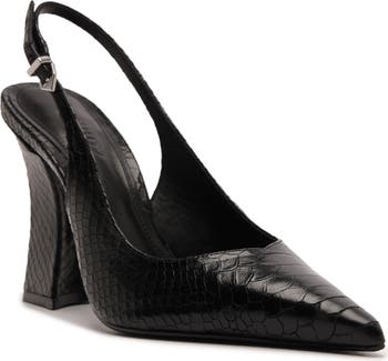 Complete your look with the modern sophistication of this pointy-toe slingback pump fashioned from snakeskin-embossed leather.