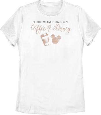 - Add a bit of magic to your mom's day with this stylish new women's t-shirt! Featuring the phrase: "This Mom Runs On Coffee and Disney" along themed drawings printed below.