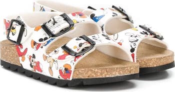 The Mickey Cartoon Print Sandals with cork footbed and double buckle closure. All over print with Mickey Mouse characters on a background.