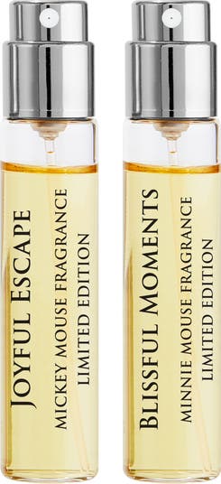 - Joyful Escape Mickey Mouse Fragrance (0.27 oz.): this enchanting scent opens with a burst of crisp bergamot, juicy green apple and the subtle sweetness of almond, creating a vibrant and inviting first impression. As the fragrance unfolds, it reveals a heart of fougère, infused with the delicate allure of jasmine and the creamy warmth of sandalwood. These notes blend seamlessly to form a refined, aromatic center that is both