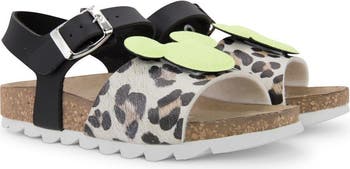 The Mickey Logo Leopard Sandals with cork footbed and buckle closure around ankles. Made with leather and decorated with Mickey Mouse logopatch, which sits on top of a leopard print background, near the front of the sandals.