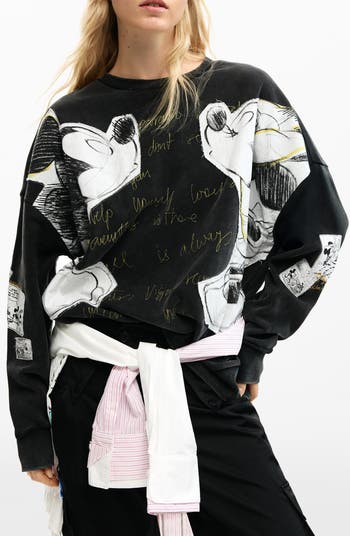 Your favorite cartoon power couple makes a public display of affection in raw-edged patches on this artfully faded French terry sweatshirt decorated with a whipstitched logo at the nape.