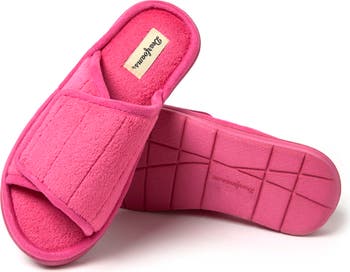 Boasting temperature regulating material alongside versatile indoor/outdoor outsoles, these slides are a smart choice for relaxing around the house and beyond! Open toe slide silhouette allows air flow and breathability. Ideal house shoe for warmer months and climates while protecting against cold tile floors. Rubber outsole provides slip resistant and long lasting underfoot support. Ideal as an indoor/outdoor option, great for quick trips to the market or to walk the dog. Each slipper is fitted with a multi-density cushioned insole with gel-infused memory foam for a cloud-like feeling on your feet. Plus, increased heel and arch cushioning adds extra comfort for the ultimate in lounging style. Our adjustable slides are machine washable so that you can always have a fresh pair of slippers! Gentle cycle in cold water, air dry!