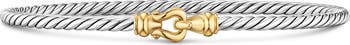 This gleaming, cabled sterling silver cuff bracelet designed with a nitinol core for flex movement is centered with a 14-karat gold buckle. The signature cable began as a piece that David Yurman hand-twisted from 50 feet of wire and has since evolved into a myriad of designs.