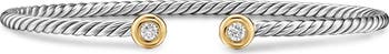 This handcrafted cabled sterling silver cuff bracelet designed with a nitinol core for flex movement is capped with 14-karat gold and diamond bezels.