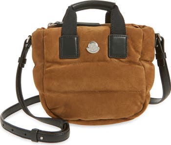 Inspired by the label's iconic puffers, this ultracompact tote is made from box-quilted suede and boasts a trapezoid silhouette with a removable crossbody strap.