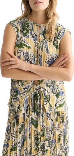 Soft pleats enhance the easy drape of this flowery top tethered with dainty front ties.