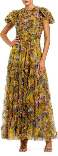Elegant ruffled gown with textured floral detailing, short sleeves, and a flowing silhouette—designed to make a striking statement at any evening or special event.