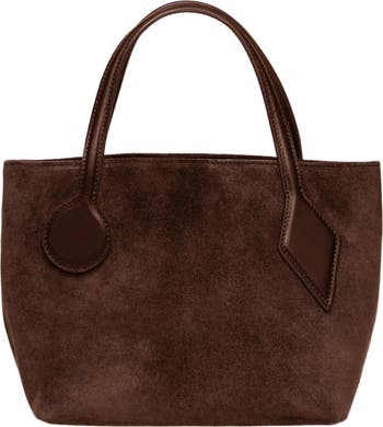 Geometric handles create architectural intrigue on a mixed-leather tote featured in a scaled down profile with a removable zip pouch perfect for your smaller essentials.